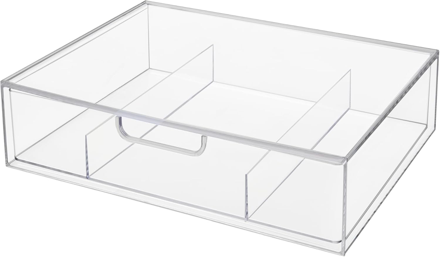 - Multipurpose storage bin will help maximize space around the home, allowing you to keep every room tidy. Organization and storage with this clear acrylic container allows you to find what is inside quickly, making organizing fast and easy. Removable storage drawer holds pens, pencils, notepads, and calculators.