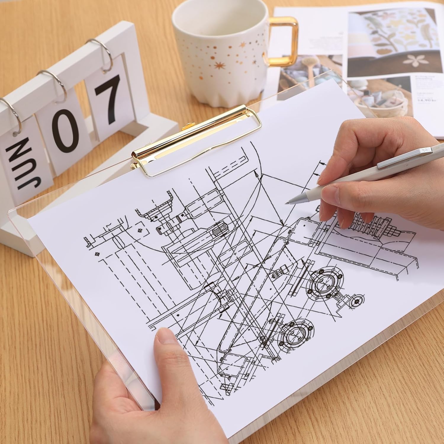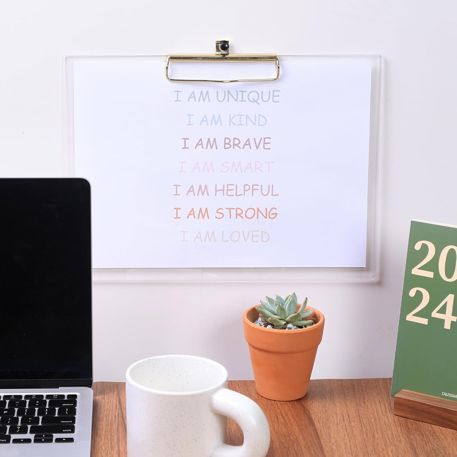 - ✨ STYLISH & ELEGANT - Showcase your impeccable taste with our crystal-clear clipboard. Our clipboard is thick, transparent, and has a smooth surface and edges. The chic gold metal clip enhances the overall appearance of the clipboard, adding style and elegance. Working with our clipboard will leave you feeling inspired.