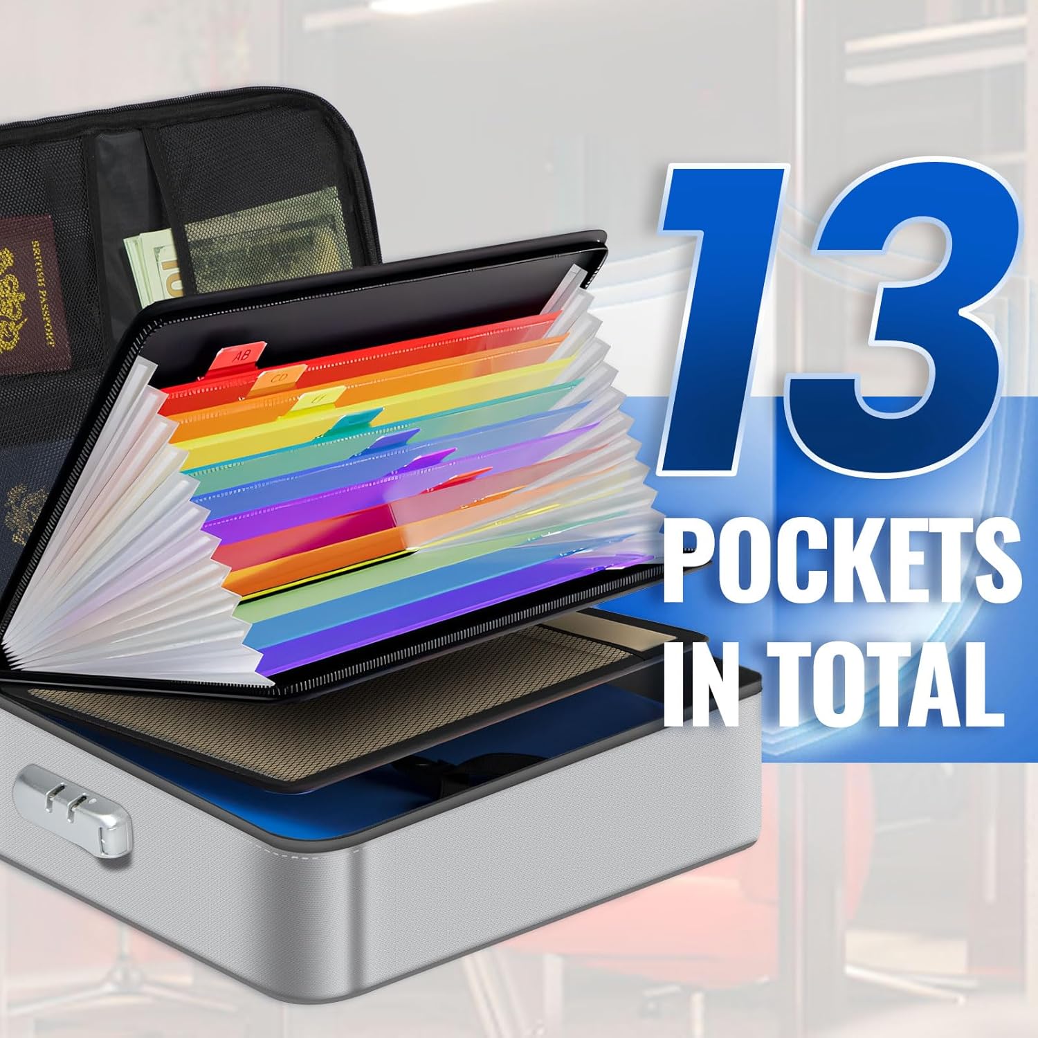 - Upgraded Ultra Capacity: Our fire safe bag has multi-layer of design, with the Jumbo Dimension: 15.7 x 11.8 x 3.9 inch, includes 8x passport mesh bag, 16x card slots, 5x folder layers, removable 13-layer accordion file organizer, and a large space for document storage. It's perfect to store birth certificate, tax filing, diplomas and certificates. And keeping your document well and organized.