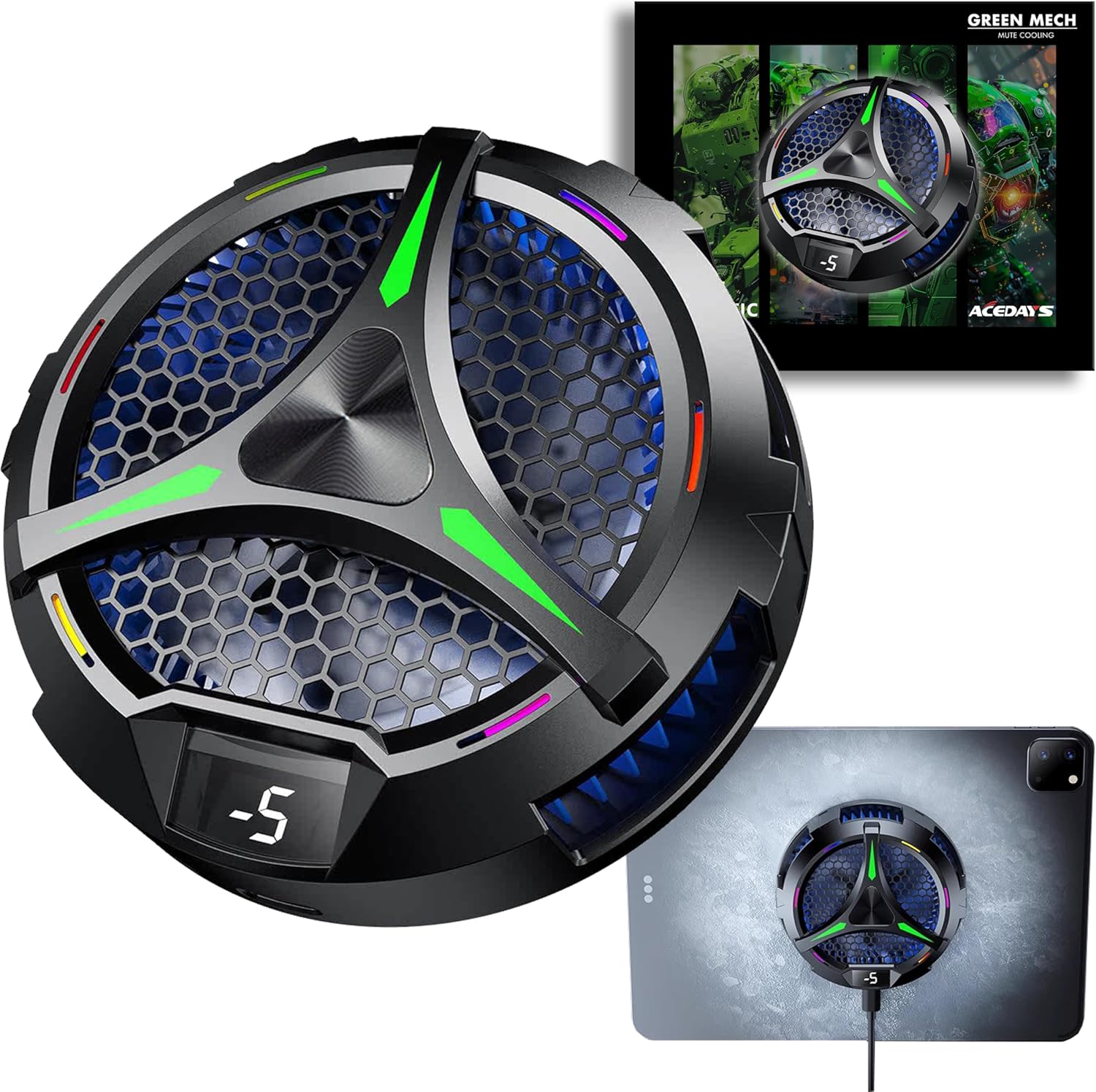 - ❄ 【GREEN MECH】The ACEDAYS iPad cooler is a brand-new design created for tablets, laptops, the Steam Deck, Switch, and other devices used for extended periods. Made with an alloy, PC, and magnets, it features colorful lights and an LED temperature display when connected to power, with two levels of cooling adjustment.