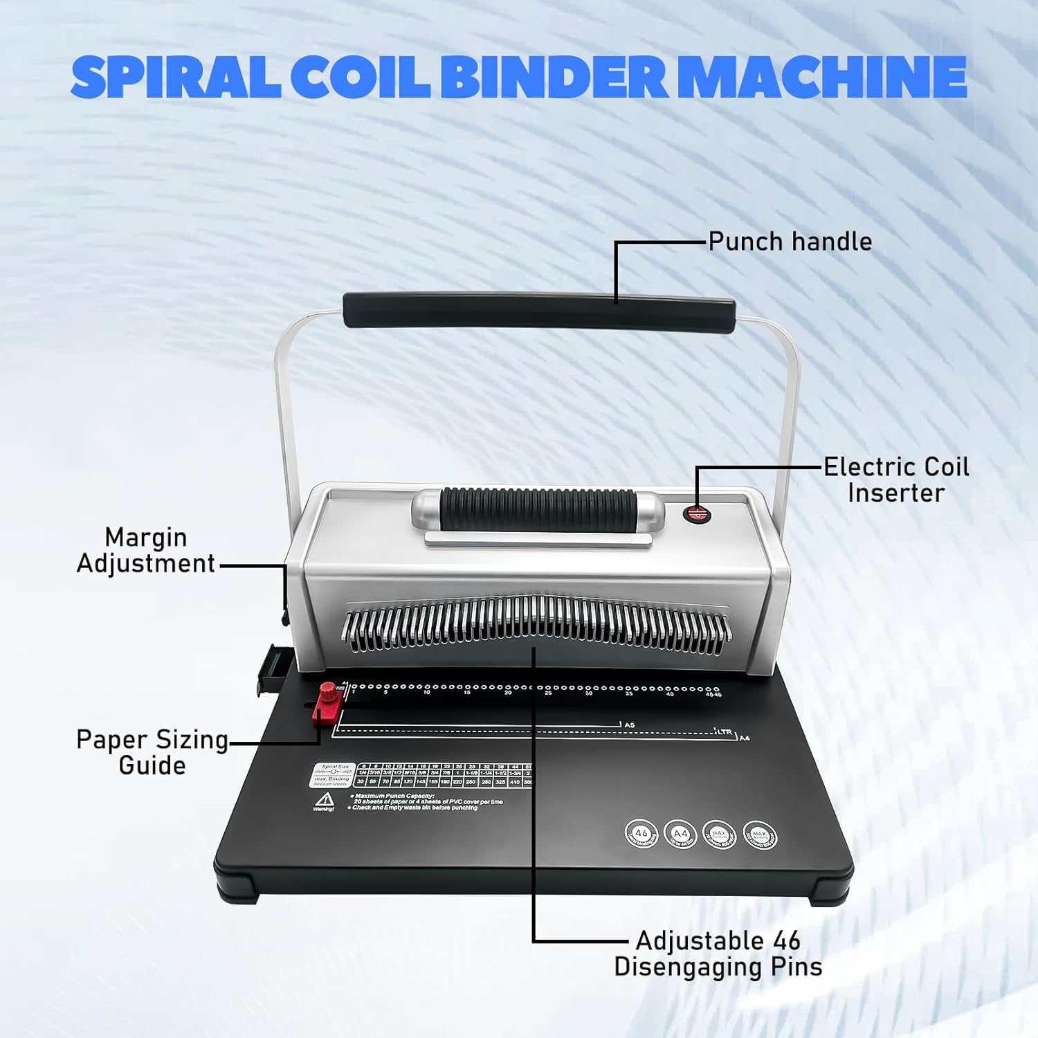 - 【Humanized Design】This upgraded coil binding machine has a sturdy handle, and when punching holes by hand, just apply steady pressure and can punch up to 20 sheets of 80gm paper at a time. When using coils, you can easily increase efficiency by inserting them manually or using a motorized coil inserter.