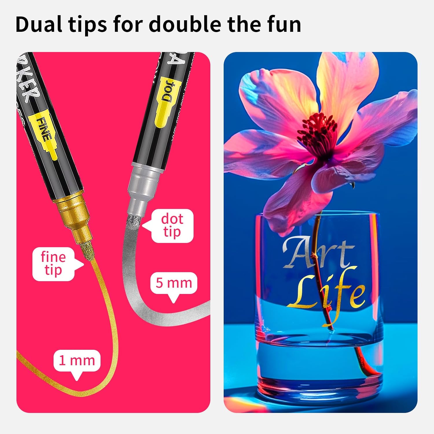 - DUAL TIP: Our rock painting pens come with a 1-5 mm dot tip and a 1 mm fine tip. Designed to give you the flexibility to switch effortlessly between fine lines and bold strokes, these paint pens acrylic markers expand your creative horizons and enhance the intricate details in your work.