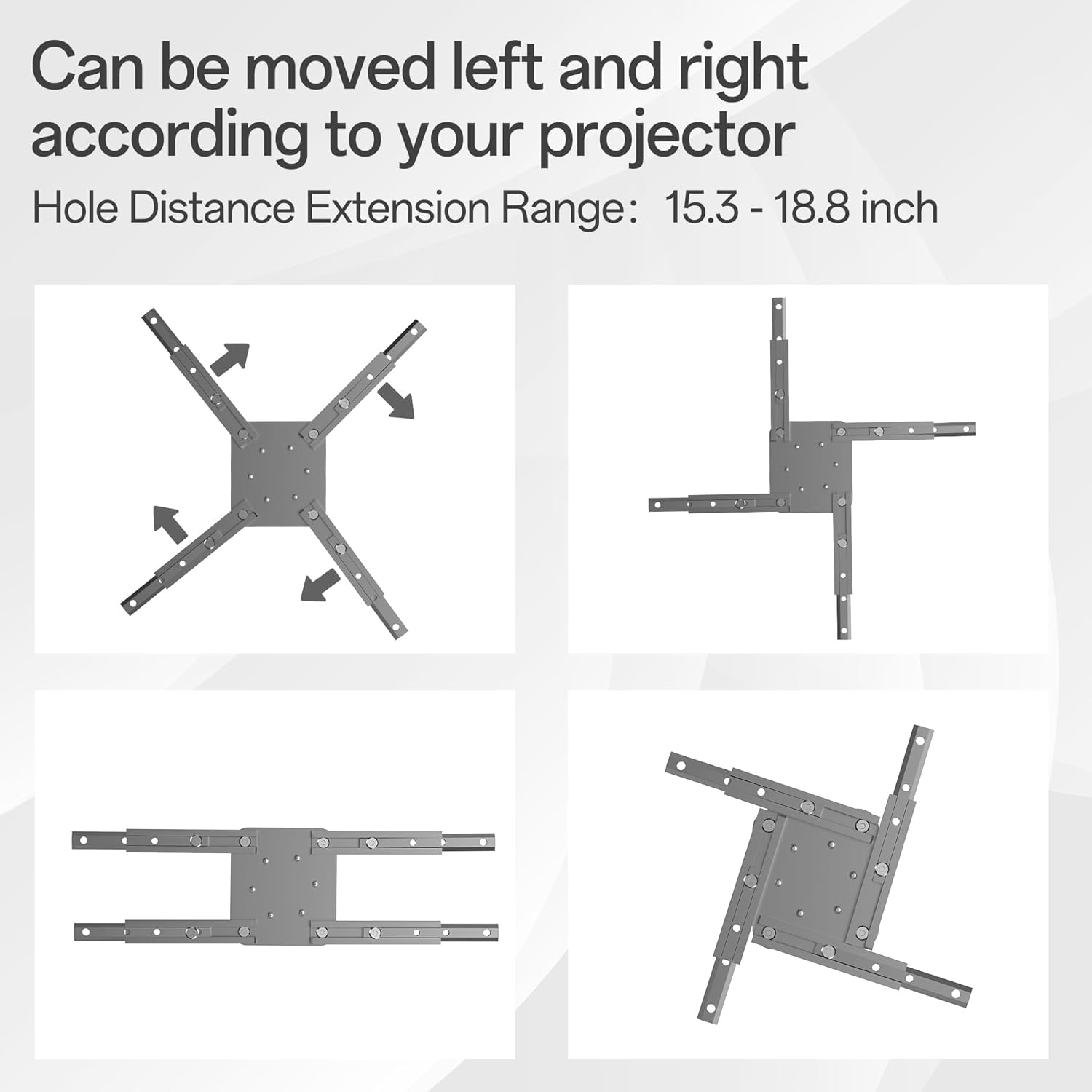 - 【Product Description】The installation height of the ceiling mount projector is adjustable, the telescopic height is 6.4 - 8.46 inches; the adjustable length of the telescopic arm is 6.1 - 7.87 inches; the shortest hole spacing is 15.3 inches, and the longest hole spacing is 18.8 inches. Just drill 4 holes in the load-bearing wall or ceiling to complete the installation. Perfect for use in classrooms, conference rooms, hotels, home theaters, or anywhere a projector needs to be installed!