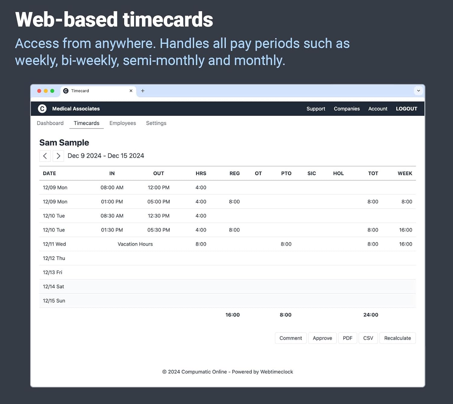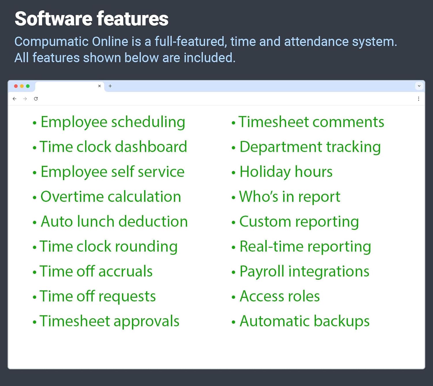 - CLOUD HOSTED WEB BASED SOFTWARE: Powerful features in a user firendly package. Punches are transferred automatically to the cloud in real-time. If you lose the internet, no problem, the clock will store punches until your internet connection is restored. Universal compatibility with Windows and MAC and any standard web browser. No app installation needed, with our intelligent mobile friendly responsive deisgn the website automatically adjusts to the most efficient format for any device (phone, tablet, laptop, or pc). Employees can be provided with a self service login to monitor their own time and request time off. Also allow web punching if desired on a per employee basis.