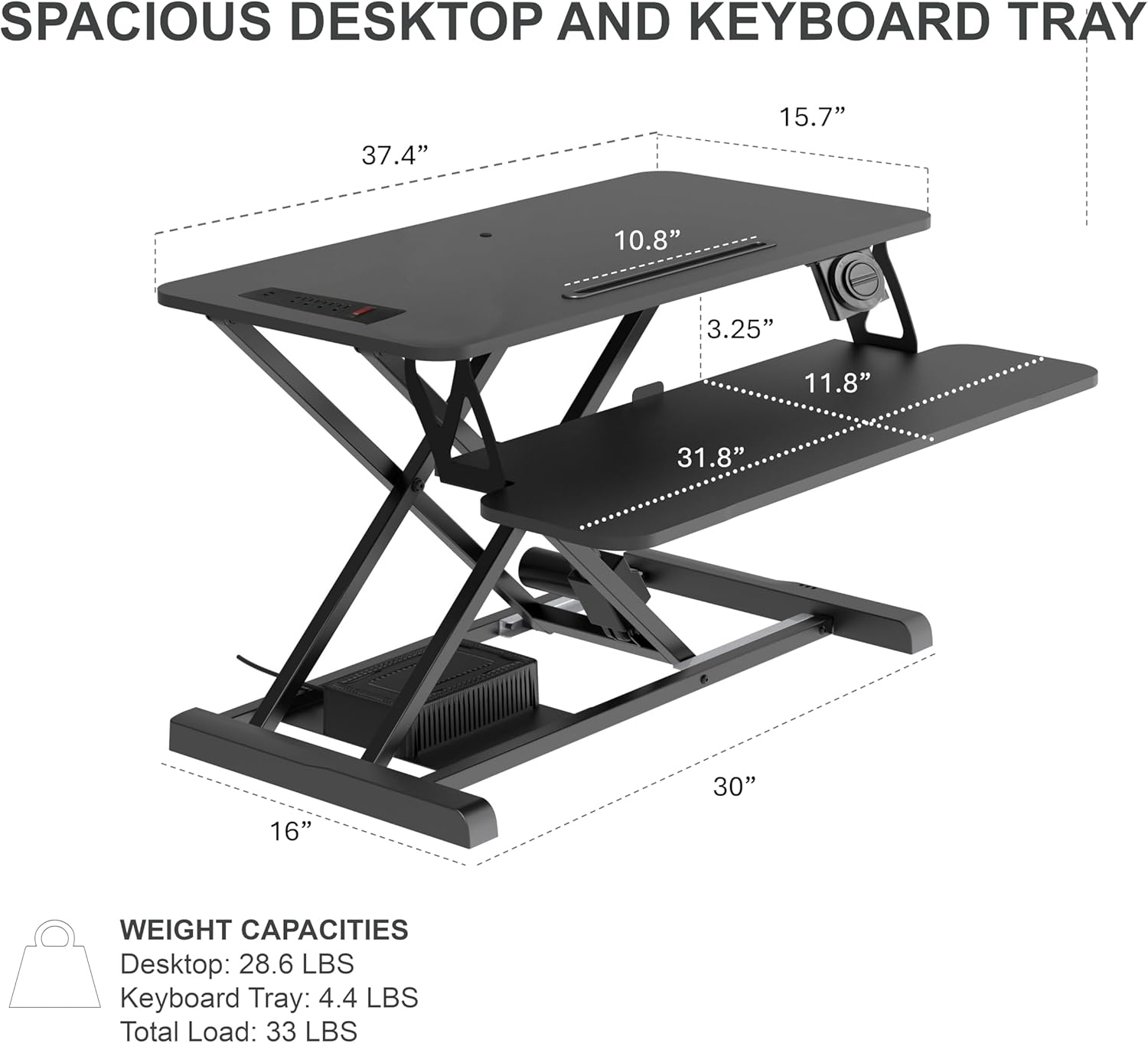 - Large electric stand up desk workstation - 37.4"x15.75" desktop work surface can hold two monitors up to 31"; 31.8"x11.8" keyboard tray can also hold a laptop, plus your mouse while keeping arms in an ergonomic position.