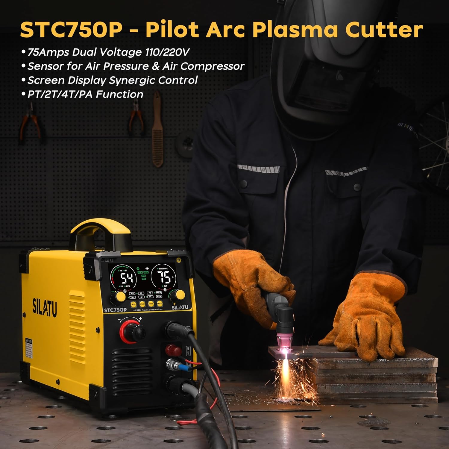 SILATU 75Amps Plasma Cutter, Large LED Display, Non-Touch Pilot Arc, Air Sensor Technology, 110/220V Dual Voltage IGBT Inverter Plasma Cutter Machine, 1'' Max Cutting Thickness for Beginners DIY