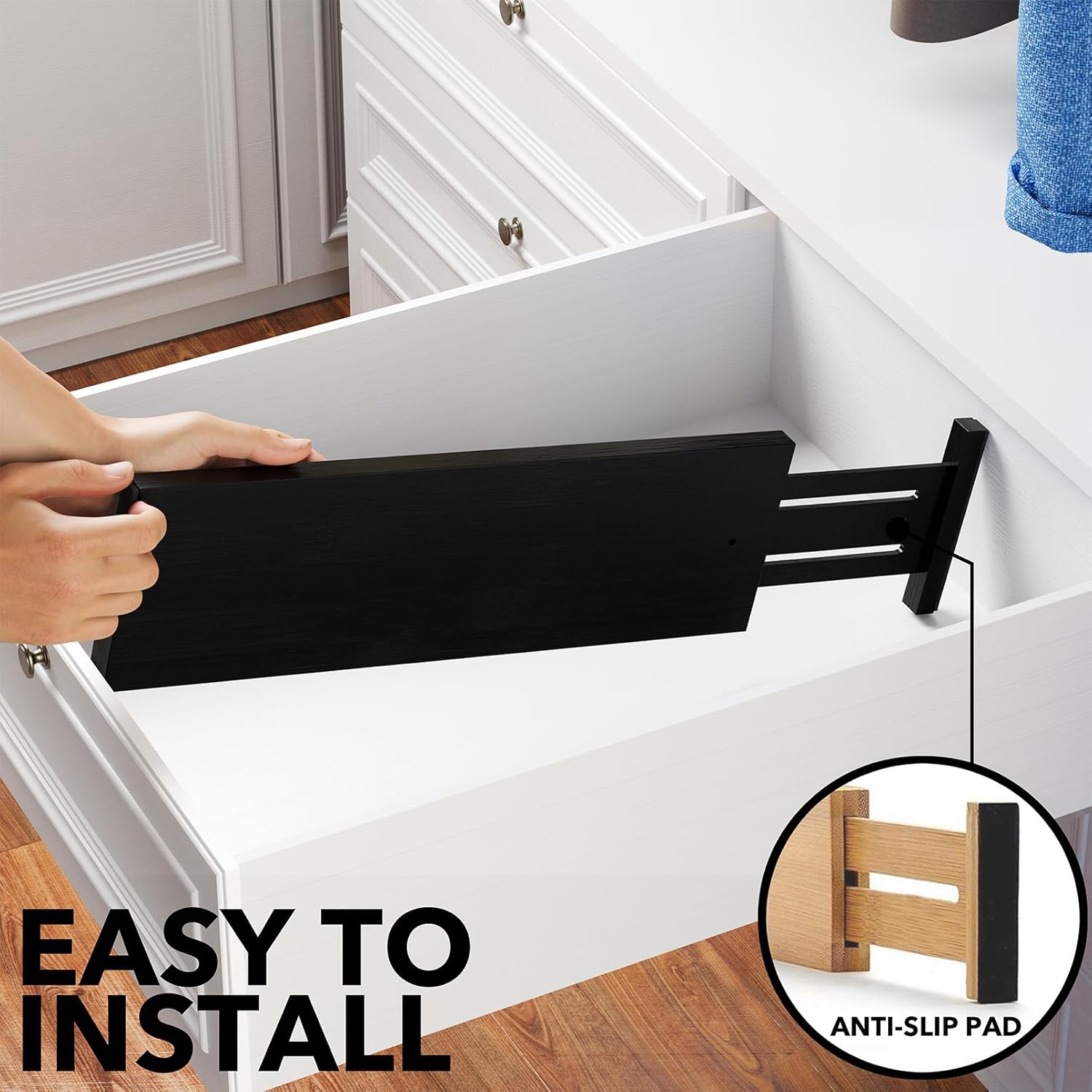 - Drawer Dividers That Stay in Place: Strong spring-loaded design makes them sturdy dividers, with non-slip rubber pads in the end, keeping it stay put all the time and protect your drawers from scratches