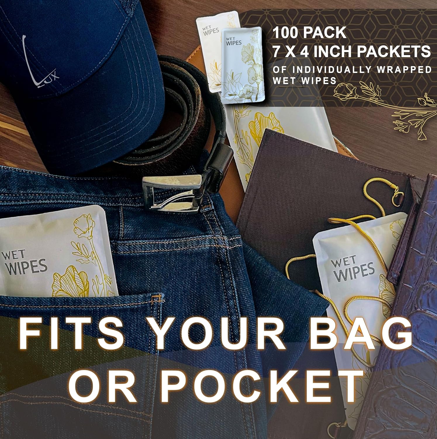 Luxury Wet Wipes, 100 Individually Wrapped Microfiber Textured Non-Scented Personal Hygiene Cleansing Wipes for women and men. Clean and refresh at the gym, camping, outdoors, and sporting events.