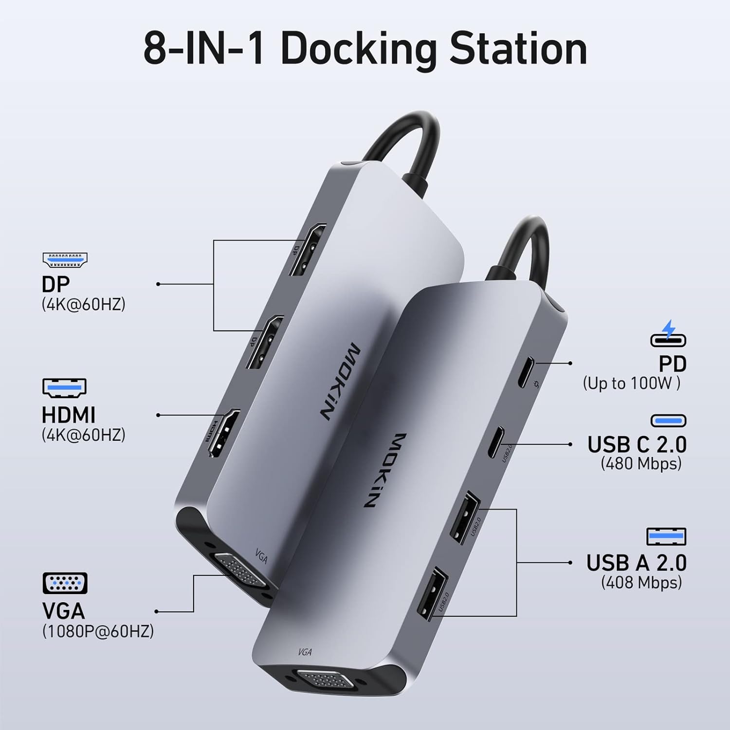 - 【8 IN 1 USB C Docking Station】USB C Docking Station Dual DisplayPort with 2 DP(4K@60Hz), HDMI(4K@60Hz), VGA(1080P@60Hz), USB C 2.0, 3 USB A 2.0, PD Charging Port(MAX 100W). Please note: If you use it to connect to a Macbook, it only supports mirror mode, not supports extended mode, no matter how many monitors you connect