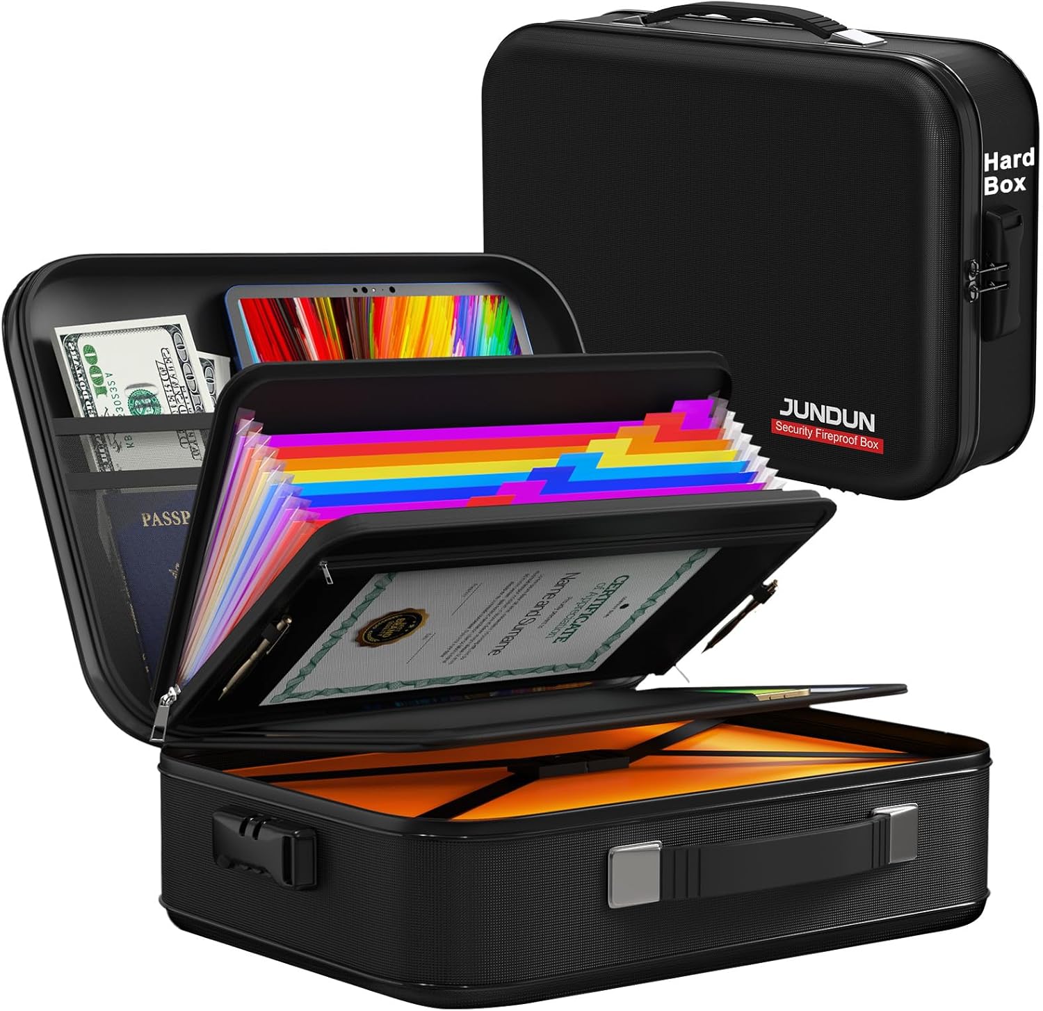 - Hard Shell Innovative Design : fire box safe for documents is equipped with Silicone coated fiberglass and a hard shell on the top and a hard and thick plastic board on the side, which looks very sturdy and durable. When heavy objects are placed on top, document organizer is well supported, which effectively protects the documents inside the box. Compared with fireproof safe ,It is something more portable if a person needed to run out of the house in an emergency