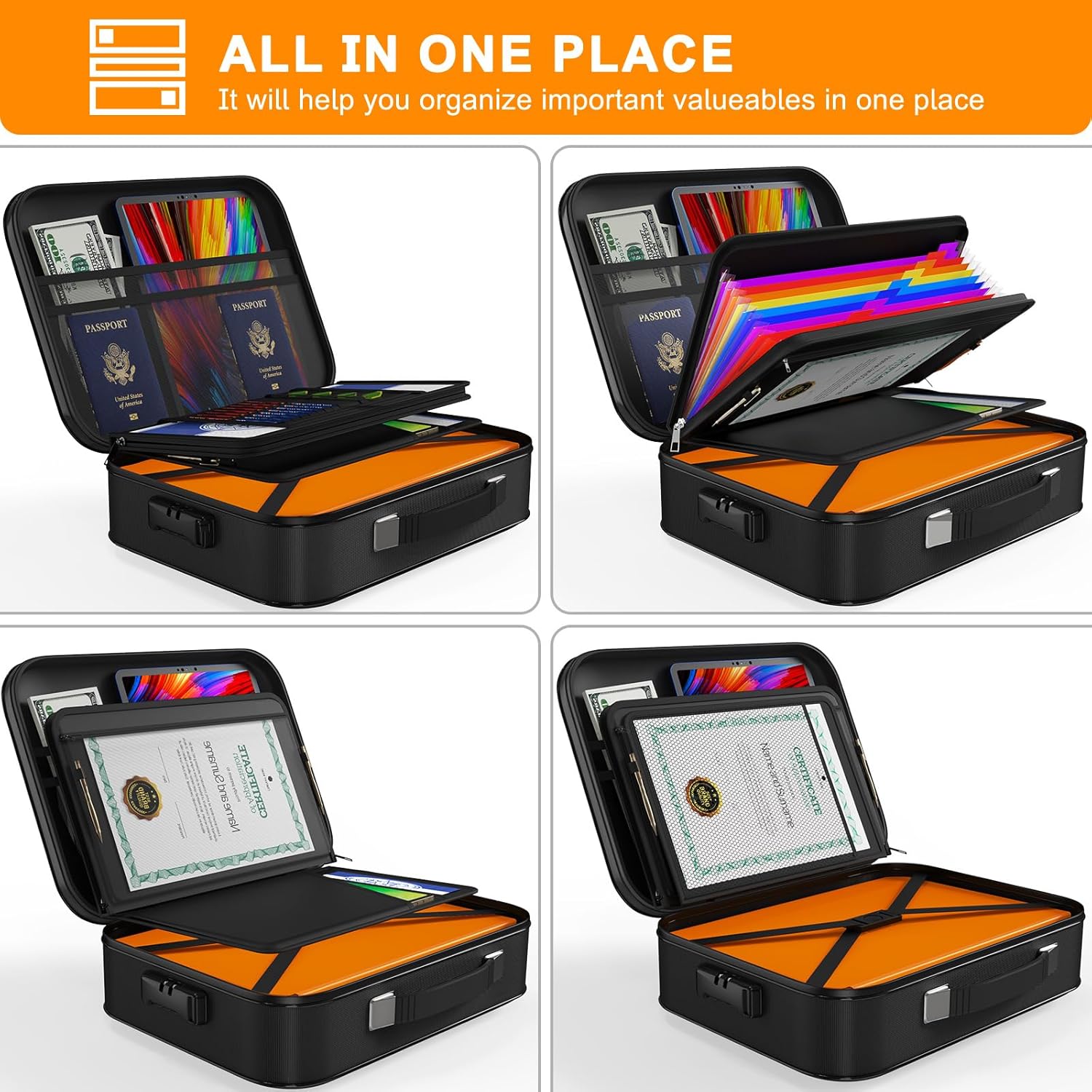 - Keeping Important documents Safe and orderly: It's also surprisingly spacious, allowing for easy organization of various items.Fireproof safe box for home documents includes 12 pockets file folder which fits letter size or A4 documents .It can help us assort documents so that we can quickly find them when we need . fire box for documents has 4 small mesh bags,16 card slots ,4 U Disk,4 large mesh pockets ,2 pen holder and one main pocket