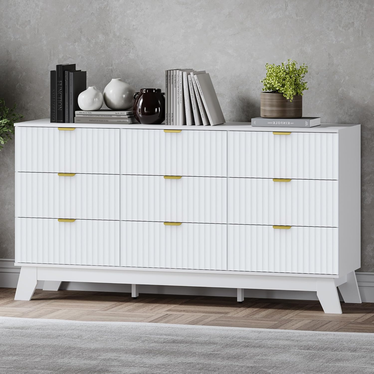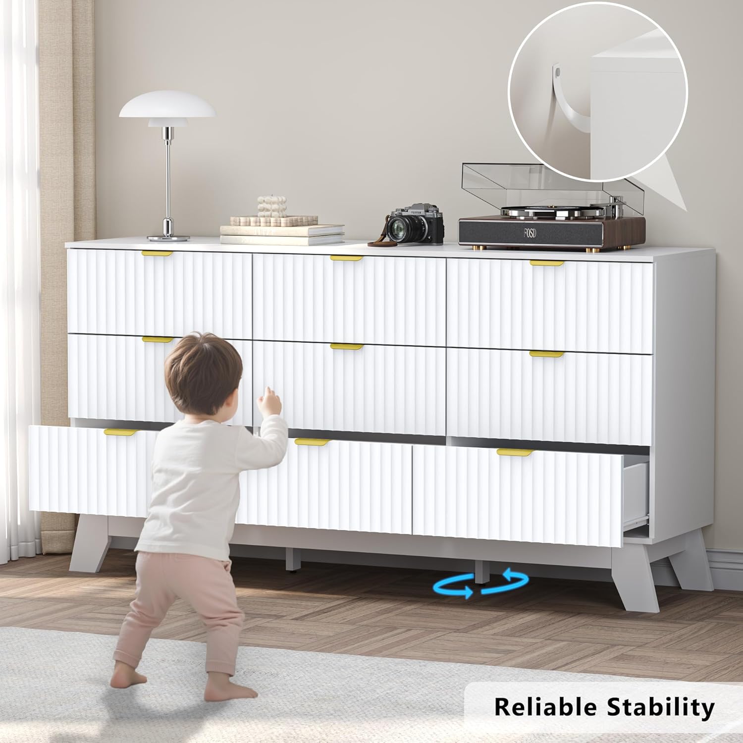 Fluted 9 Drawer Dresser, 57.1" Wide Modern Boho Chest of Drawers, Wooden Storage Dresser TV Stand for Bedroom, Living Room, Closet, Hallway, Curved Profile Design