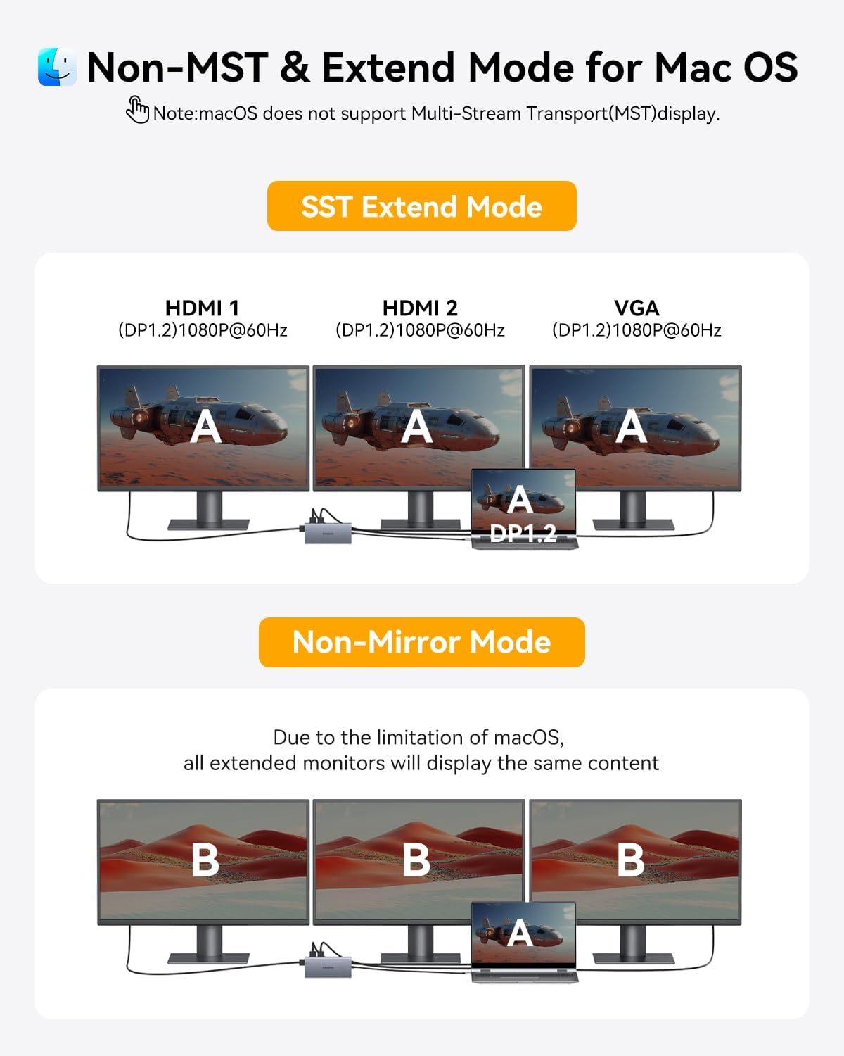 - Docking Station 3 Monitors: With this USB C Docking Station Dual Monitor hdmi Hub, you can expand 3 monitors at the same time, and for Windows laptops, The hdmi to usb c adapter can support both mirroring mode and expanded mode. The dual-monitor resolutions are: HDMI1+HDMI2/VGA: 4K@30Hz+1080P@60Hz (dp1.4); both at 1080P@60Hz in dp1.2 source. When you expand 3 monitors at the same time, the resolution is all 1080P@60Hz (dp1.4). Please note: Due to macOs limitations, for MacBook laptops, all expanded displays will display the same content image (mirroring mode only, not expanded mode).
