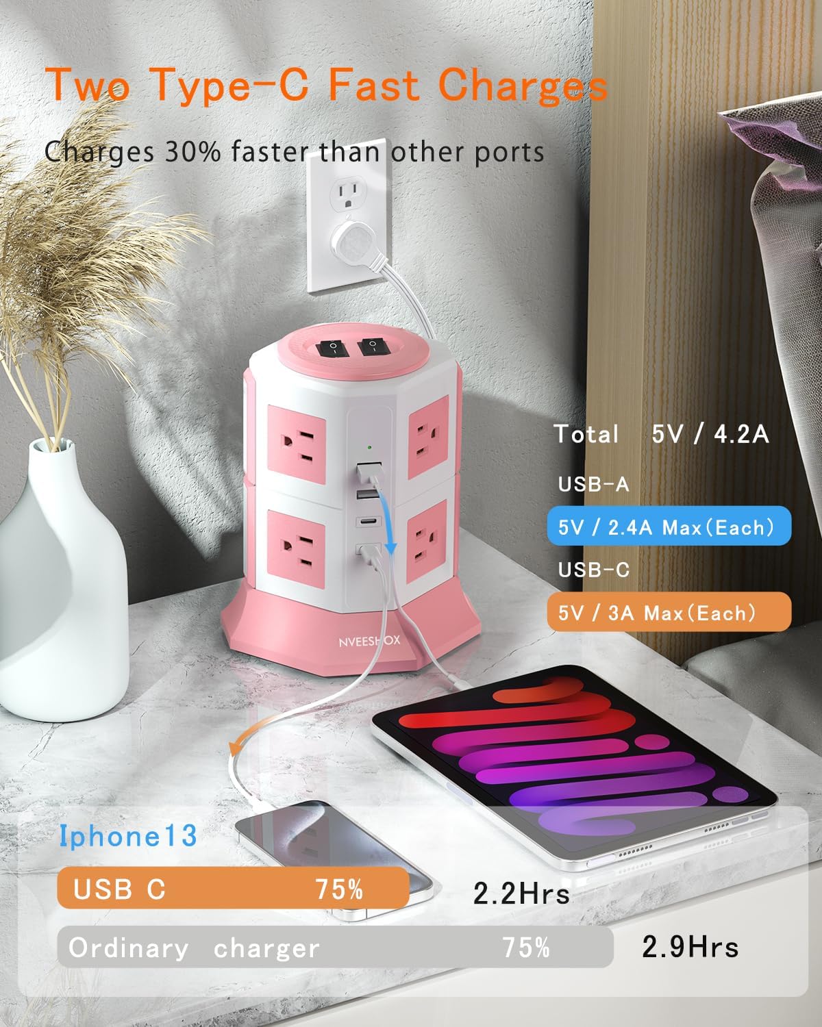 - EXTENSION CORD WITH MULTIPLE OUTLETS: The surge protector power strip tower with 8 AC widely outlets and 4 USB charging ports for a total of 4.2A, with a maximum output of 5V/2.4A per USB A port.USB C charging ports have a maximum output of 5V/3A, allowing you to power up to 12 devices simultaneously.