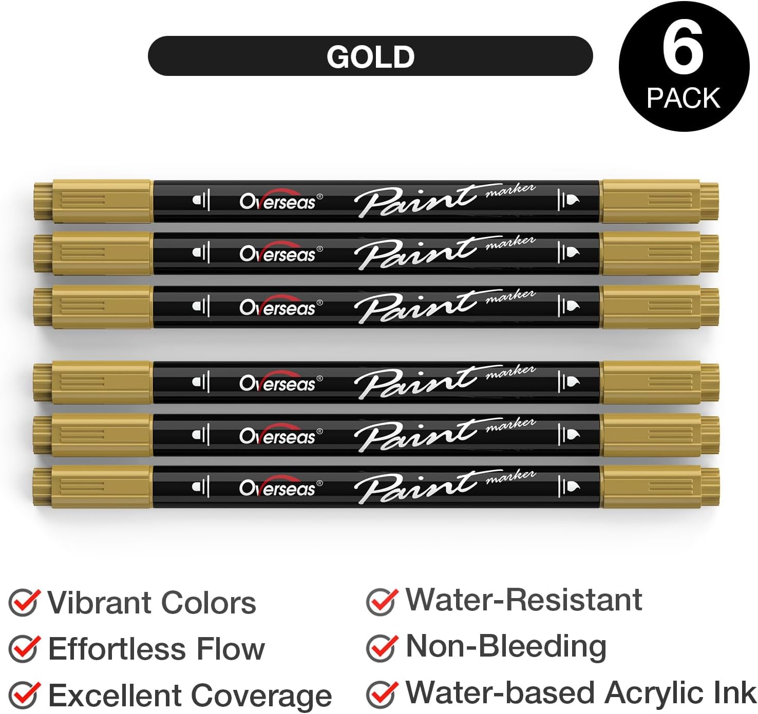 Overseas Gold Acrylic Paint Markers, 6 Pack Dual Tip Paint Pens Acrylic Markers - Dot and Brush Tip Gold Pens for Wood, Rock, Canvas, Glass, Metal, Plastic, Rubber, Fabric, School Supplies