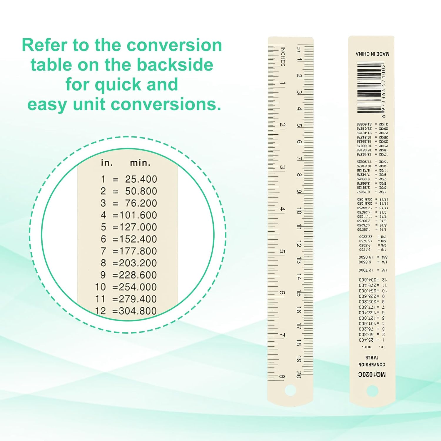 - Instruction: Use the ruler for precise measurements and calculations in both inches and centimeters. Refer to the conversion table on the backside for quick and easy unit conversion. Hang the ruler using the provided hole for convenient storage and accessibility.