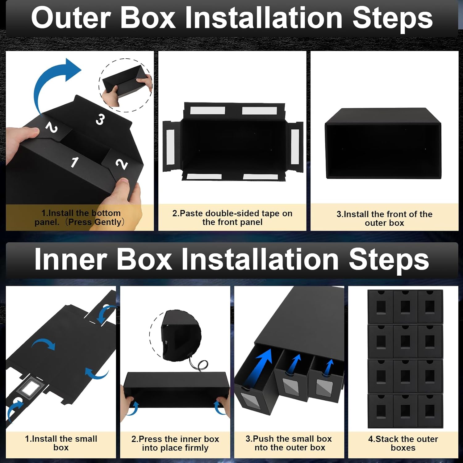 - 【Quick installation, easy assembly】: The trading card storage comes with a detailed graphic installation guide, allowing you to complete the assembly quickly. The detachable design supports free combination to create an exclusive card storage system. Comes with double-sided tape and self-adhesive points to make your card box more secure and safer to install, meeting the needs of large-scale trading card sorting!