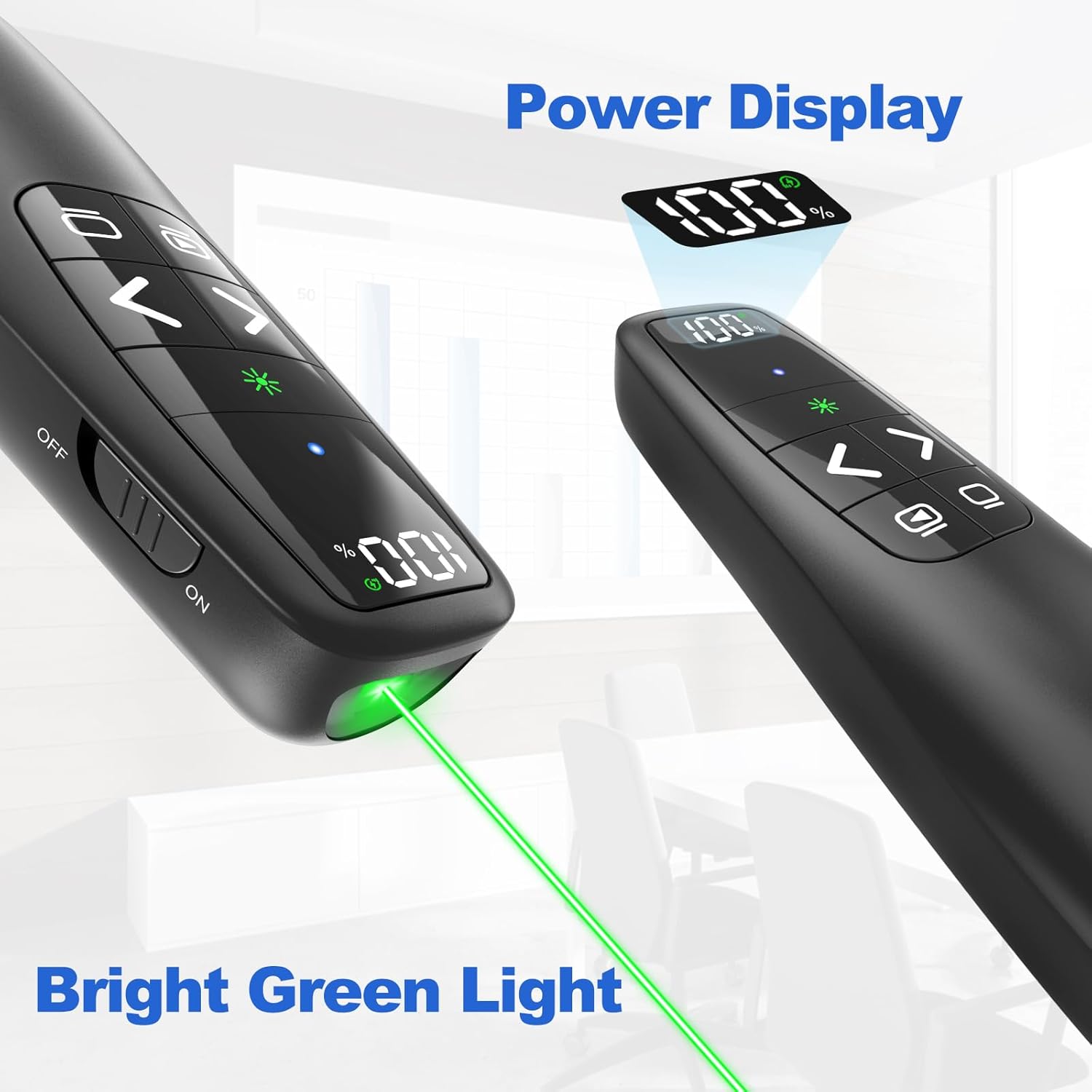 - [Presentation Clicker & Light Pointer & Compact Case]This is a presentation remote with a very bright green Light pointer. You can change your PPT/ Google slide from anywhere in the room, while pointing the specific parts of the slide by Light. PowerPoint clicker controls range:98FT/30M, Light pointer range: 328FT/100M.