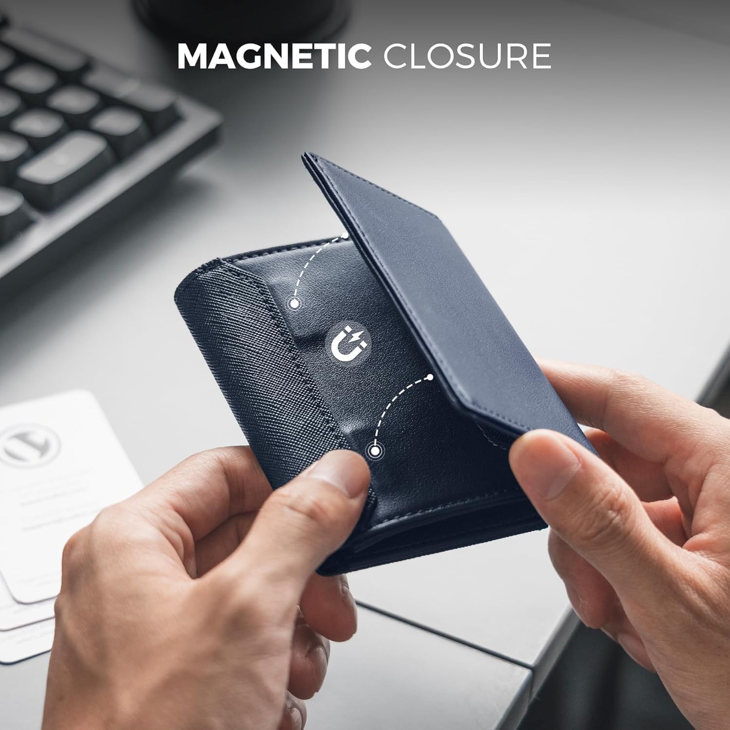 Real Leather Business Card Holder Premium RFID Blocking Card Case with ID Window and Magnetic Closure Holds Up to 40 Business Cards (Navy)