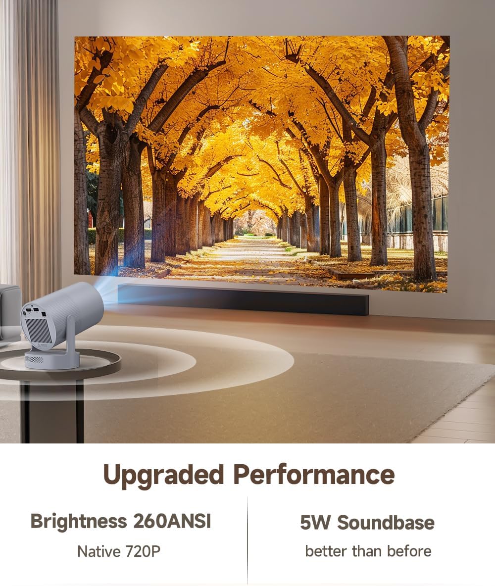 - Immersive Audio-Visual Experience: Enjoy 720P resolution with 4K support, 260 ANSI lumens, and an 8000:1 contrast ratio. The 5W Soundbase Speaker enhances both audio and visuals, making it perfect for casual movie watching, or family entertainment in your bedroom, outdoor space.