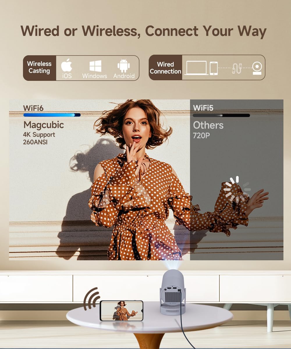 【Electric Focus】Magcubic Mini Projector 4K Support, Smart Projector with WiFi 6 and Bluetooth 5.4, 5W Soundbase Speaker, 180° Rotation, Portable Proyector for Home Theater HY300 Ultra (Grey)
