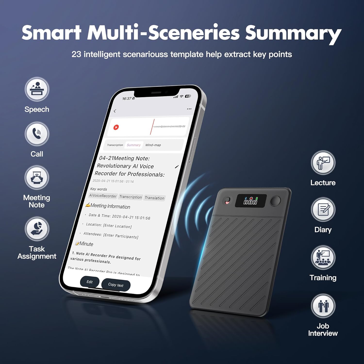 - 【Real-time Transcription & Smart Summaries】SSLine Voice Recorder with APP integrates advanced transcription capabilities, enabling swift and accurate transcription in 112+ languages. The speaker labels function allows you to visually distinguish different speakers within your recordings. AI-generated summaries helping you focus on what's most important, thus saving time and boosting your efficiency.Choose from 23+ templates optimized for scenarios like including meetings, phone calls, lectures, and interviews.