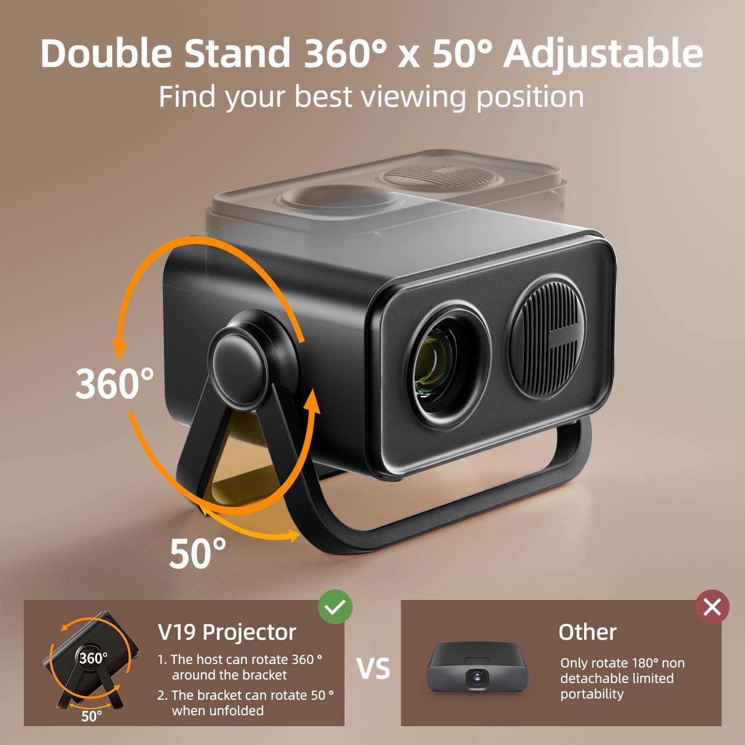 - 【Fully Adjustable Dual Stand】 Built-in dual 360° x 50° adjustable stands let you easily position your projector on any surface—no tripod needed. Compact and ultra-portable, it’s your ideal travel companion.