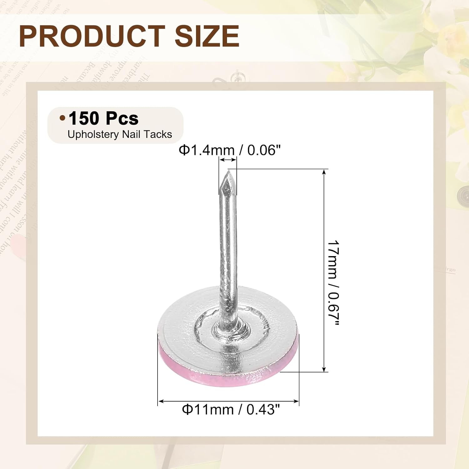 - [Size & Quantity] - The package comes with 150pcs decorative upholstery tacks. Sufficient quantity to meet your different daily needs. The overall size of upholstery nails is about 11mm x 17mm/0.43-inch x 0.67-inch(D*H)