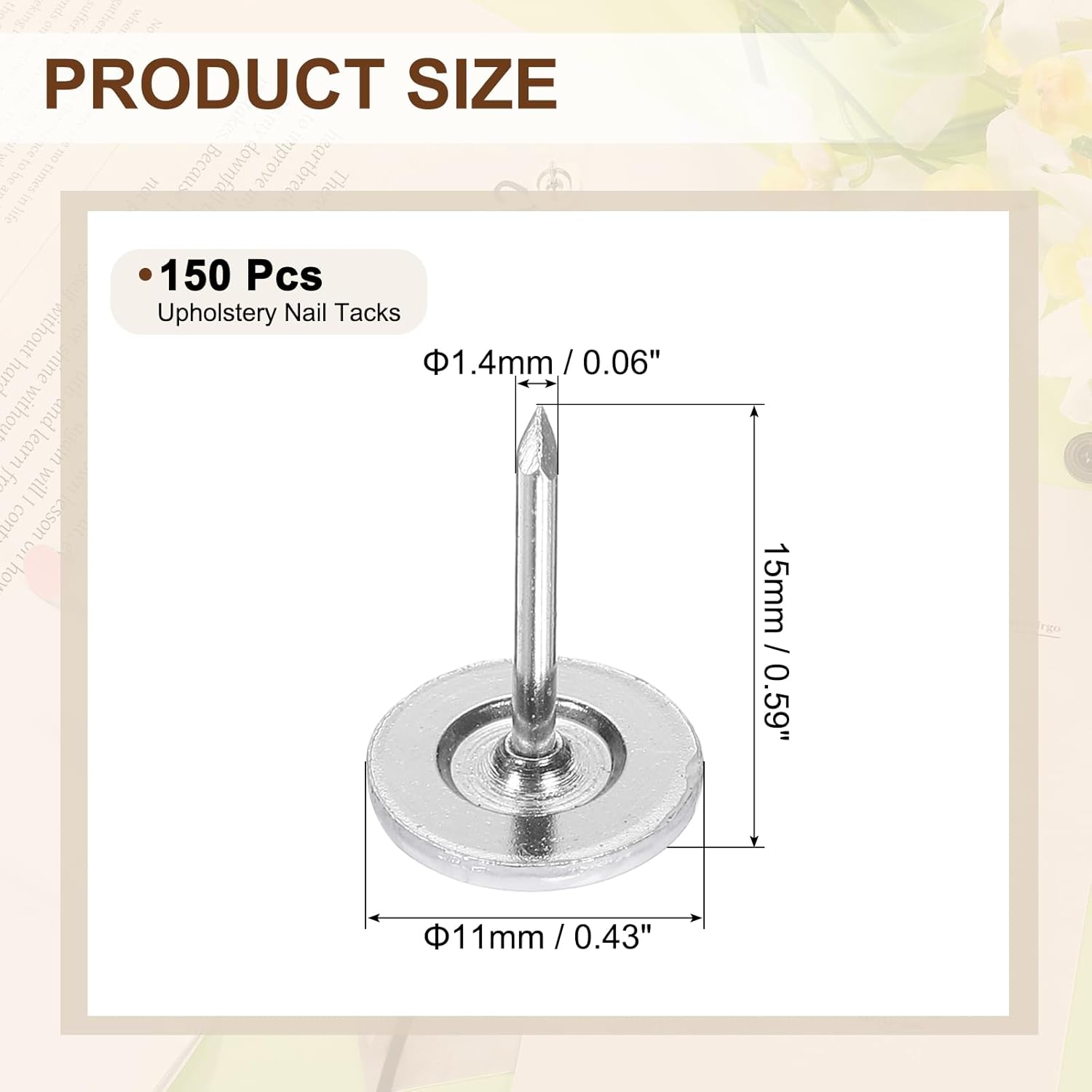 - [Size & Quantity] - The package comes with 150pcs decorative upholstery tacks. Sufficient quantity to meet your different daily needs. The overall size of upholstery nails is about 11mm x 15mm/0.43-inch x 0.59-inch(D*H)