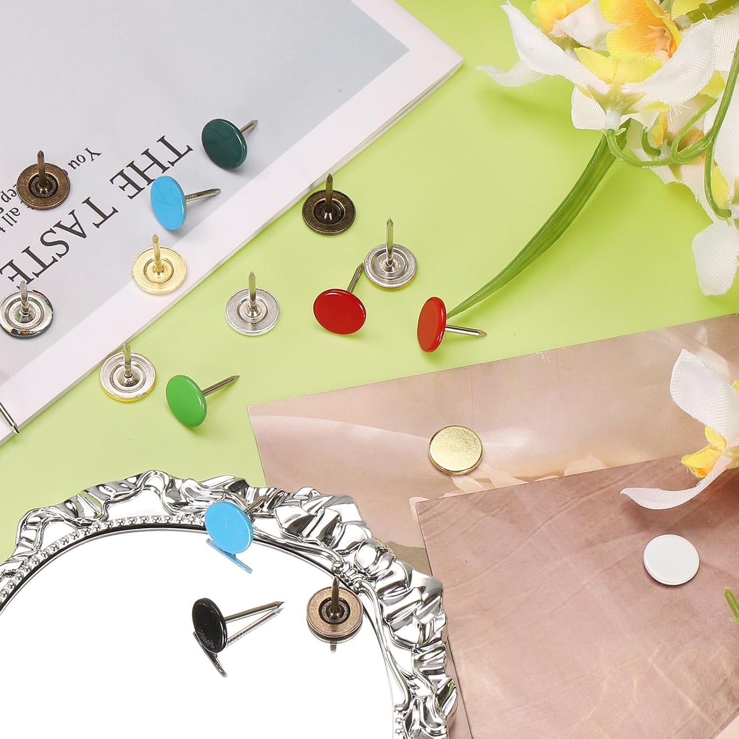 - [Wide Application] - The thumb tacks are both practical and decorative and can be used in a variety of furniture and DIY craft projects. Widely used to decorate furniture such as upholstery, sofas, headboards, chairs, benches, stools, wooden boxes, and can also be used to fix memos, pictures, maps and other lightweight items on cork boards