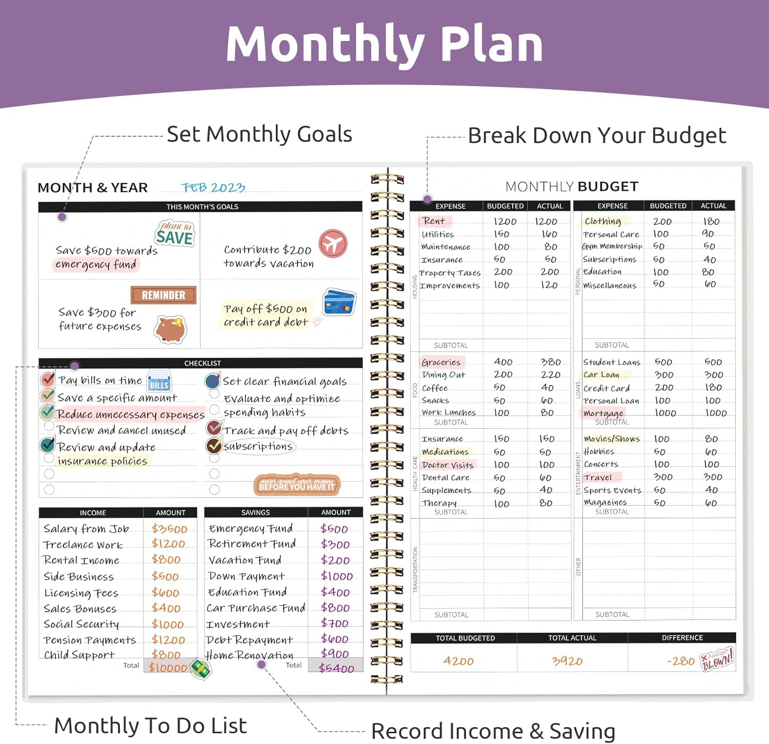 - Effective Budget Planning - Take control of your finances with the budget account book. This comprehensive planner allows you to plan and track your income, expenses, savings, and financial goals in one convenient place. With its intuitive layout and easy-to-use sections, you can stay organized and make informed decisions to achieve financial success.