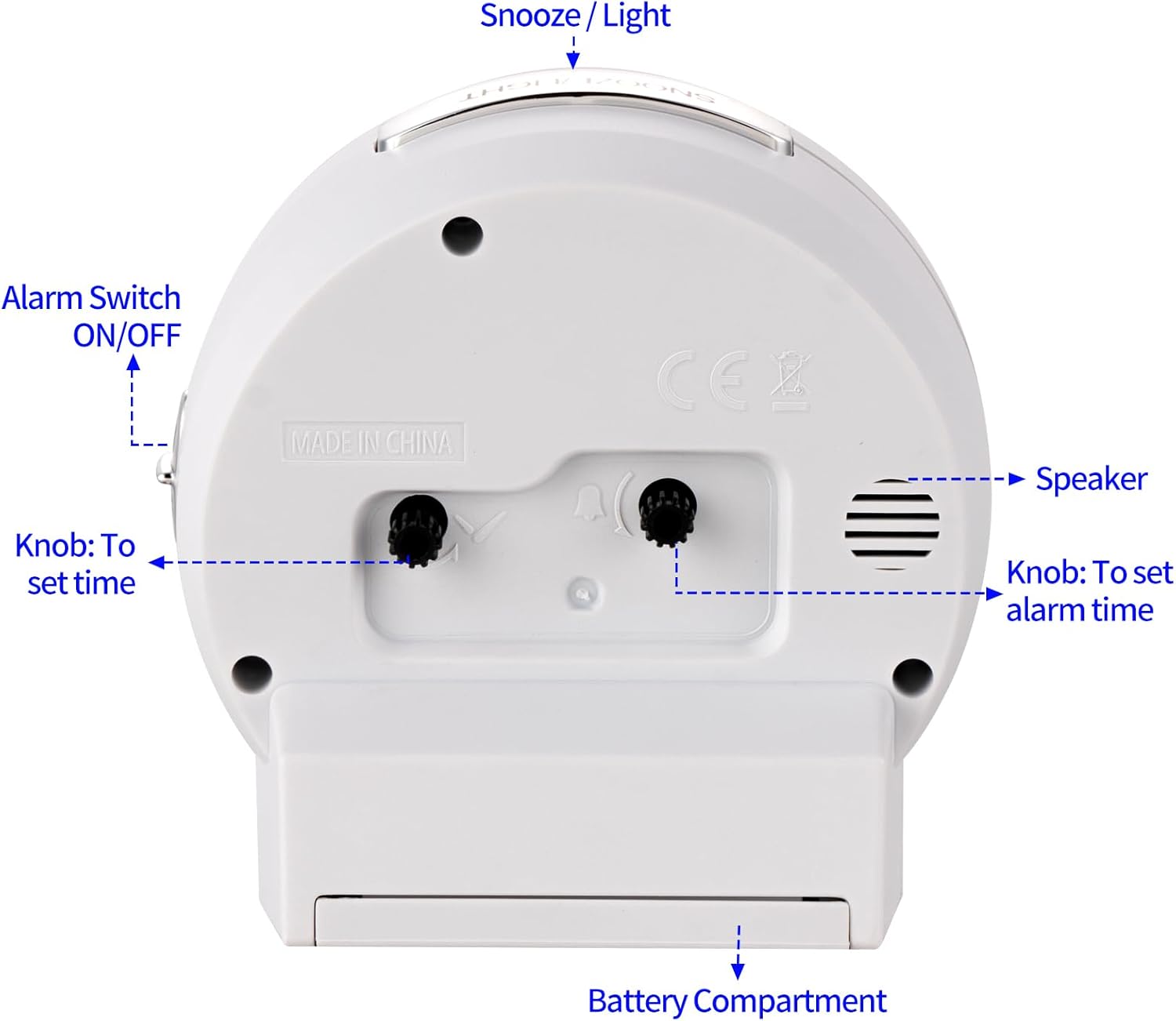 - Stable quartz alarm clock in classic design and round shape (4.3 x4 x 2.5 inch), easy operation two AA batteries(not included). Good beside wake up alarm clock for seniors, kids.