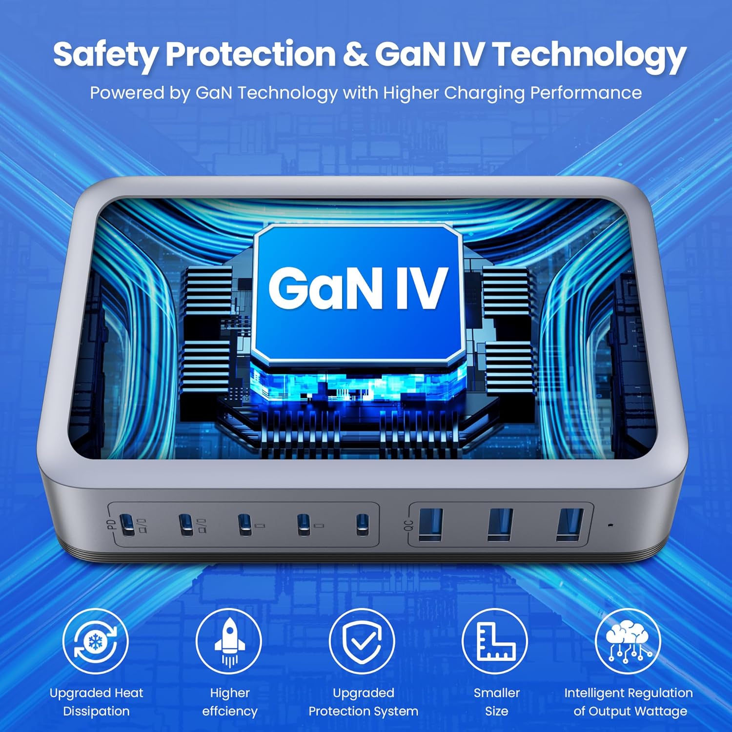 - 【8-in-1 USB C Charging Station】: The USB C Wall Charger features 5 USB C ports and 3 USB A ports for powering phones, tablets, headphones, smartwatches, game consoles and more. No need to wait, you can quickly charge up to 8 devices at the same time, and each port intelligently distributes power to ensure you get optimal charging efficiency!no need for more adapters,this 8-in-1 charging station will reduce your accessories burden and help you create an organized and clean desktop.Our GaN IV desktop charging station easy to carry,just L 4.7*W 3.3*H 1.1 inch and weighs 0.6kg,With the free 5FT/1.5m long Detachable power charging cord,Applicable to desktop, bedside, counter, nightstand, office.