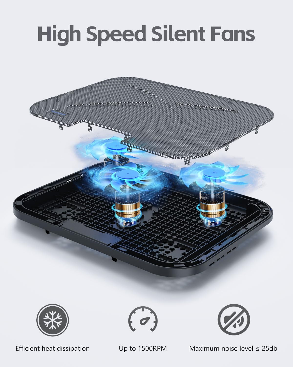 - 【3 Super Cooling Fans】Aisunkutech laptop cooling pad can effectively cool your laptop, this laptop cooler has three silent large fans, The maximum fan noise does not exceed 25db, And the fan speed can be adjusted by the wheel switch on the top.