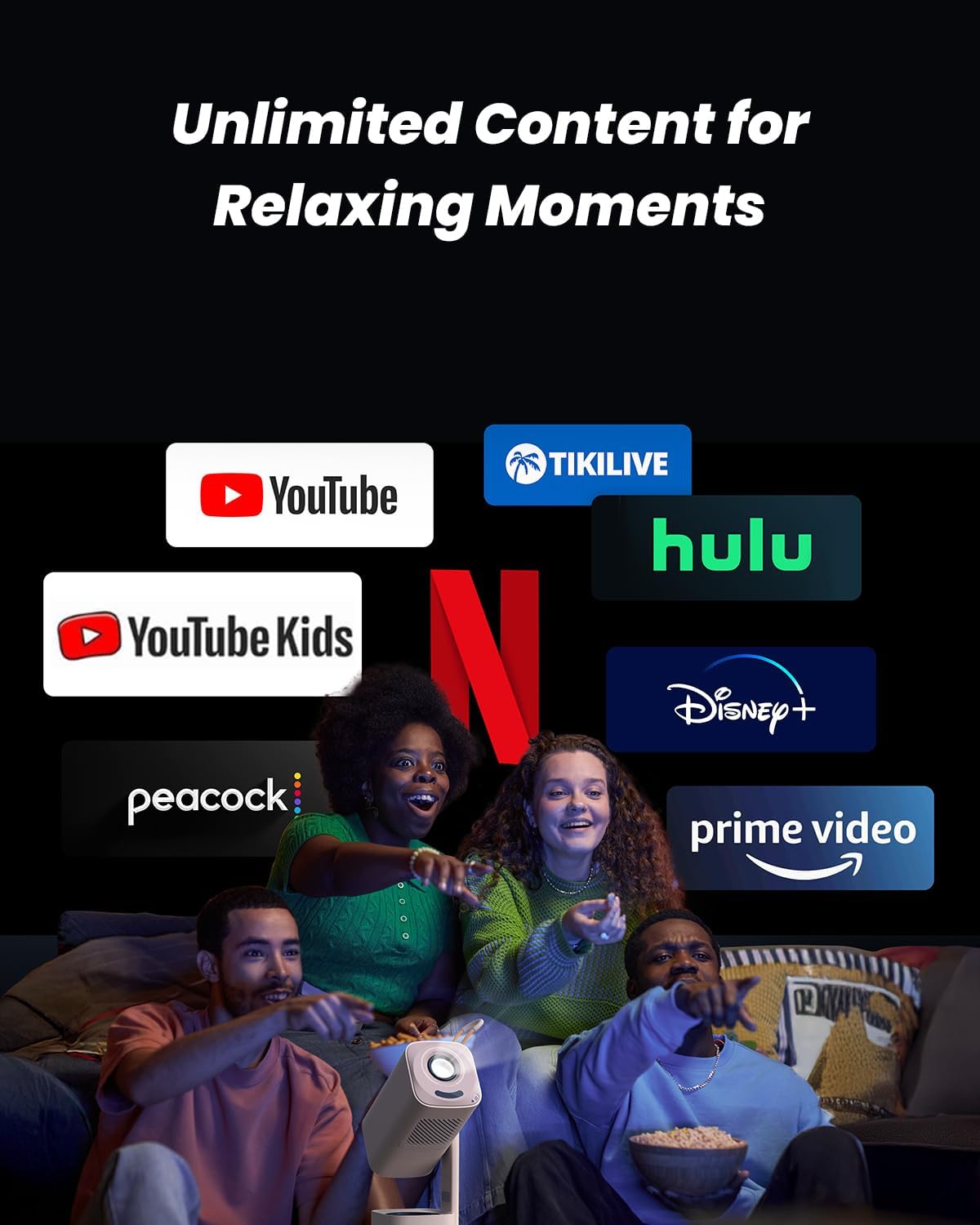 - 【Powerful 8W Turbo Sonic Bass with Dolby Audio】Turn your living room into a mini theater. Equipped with a high-performance 8W Turbo Sonic speaker and Dolby Audio, the T1 Pro mini projector delivers deep bass and crystal-clear sound that fills your space. With HDMI ARC support, you can easily connect it to your home theater system for an even more immersive experience. Besides, the portable projector doubles as a portable Bluetooth speaker. Imagine that you’re relaxing on your sofa while the T1 Pro plays your favourite playlist. What a cozy moment.:)