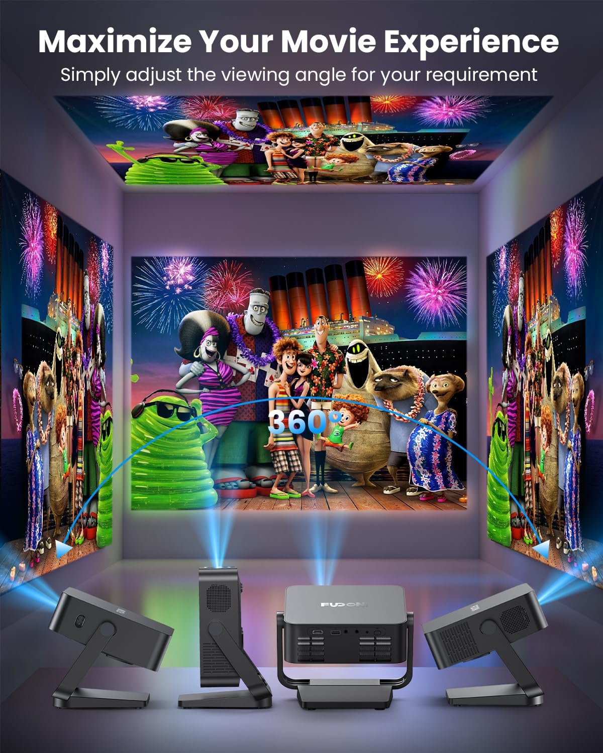 - Unique 360° Rotate and Foldable Stand: Projector features a 360° rotate supported and foldable stand for flexible wall or ceiling projection, enjoying comfortable viewing at any angle while maintaining stability. Slightly smaller and lighter than other projectors at 7.32*8.03*6.02 inches and 2.35 lbs. FUDONI projector with stand delivers a brighter and sharper image quality, making it ideal for both indoor movie nights and outdoor adventures.