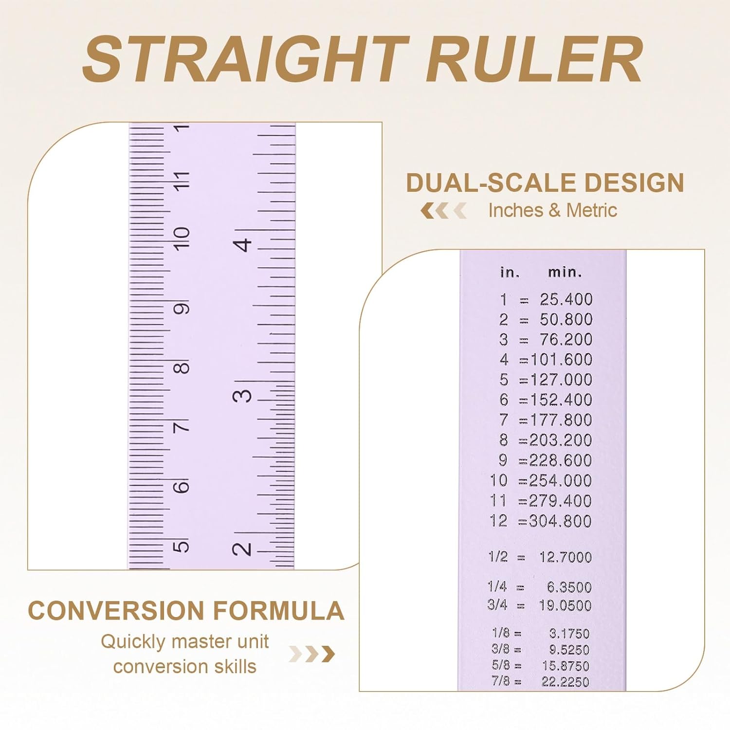 - Feature - The ruler features ink printing technology on its surface, ensuring that the scale is clear and sharp, remaining non-fading and non-blurring even after long-term use. It has a dual-scale design, and the back is carefully printed with a complete set of conversion formula for metric and SAE units, allowing beginners to quickly master unit conversion skills. Additionally, it includes a hanging hole design for convenient storage and accessibility.