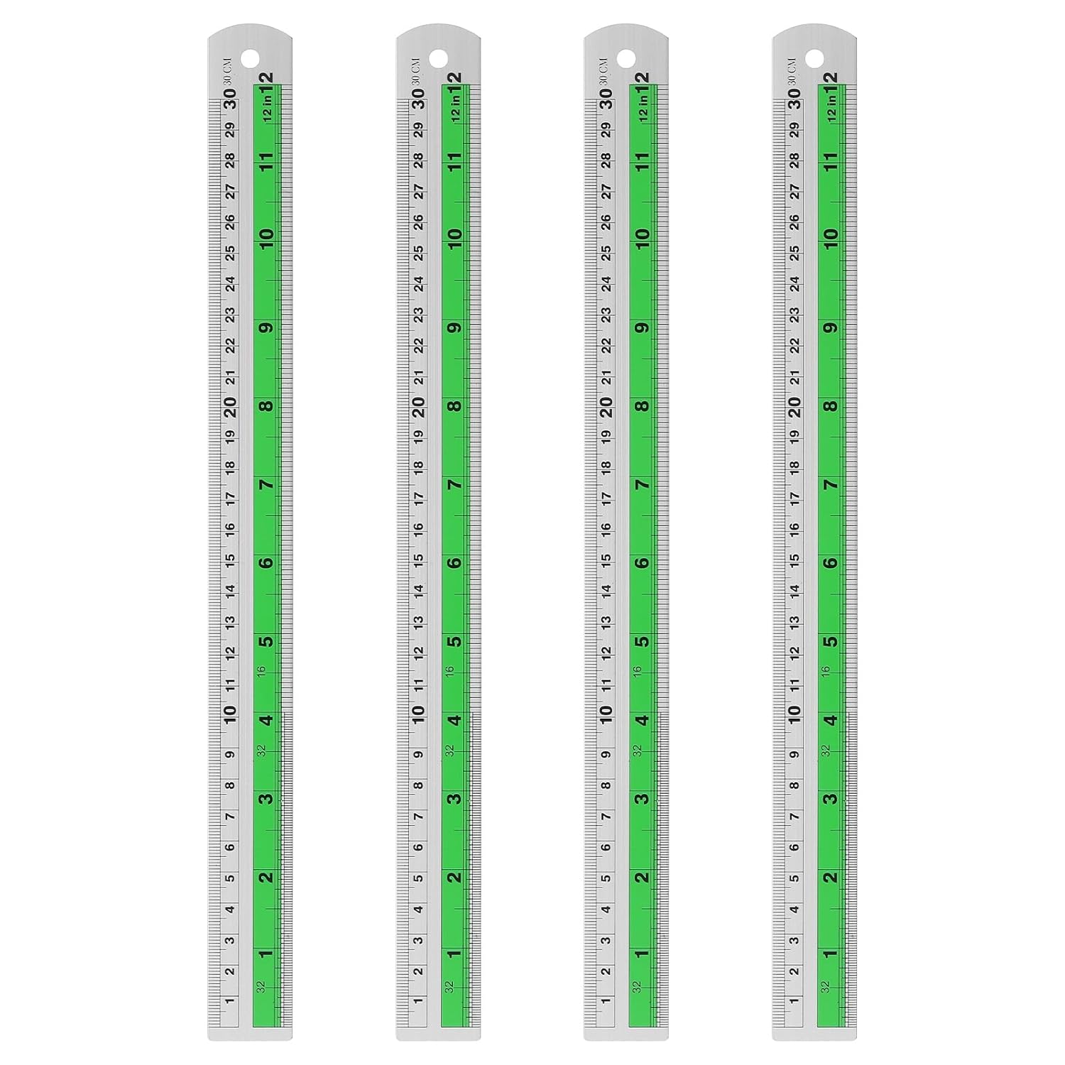 HARFINGTON 4pcs Metal Straight Ruler 30cm Metric SAE Aluminum Alloy Measuring Rulers Scale Tool with Hole for Measure Study Reading Classroom Office, Green
