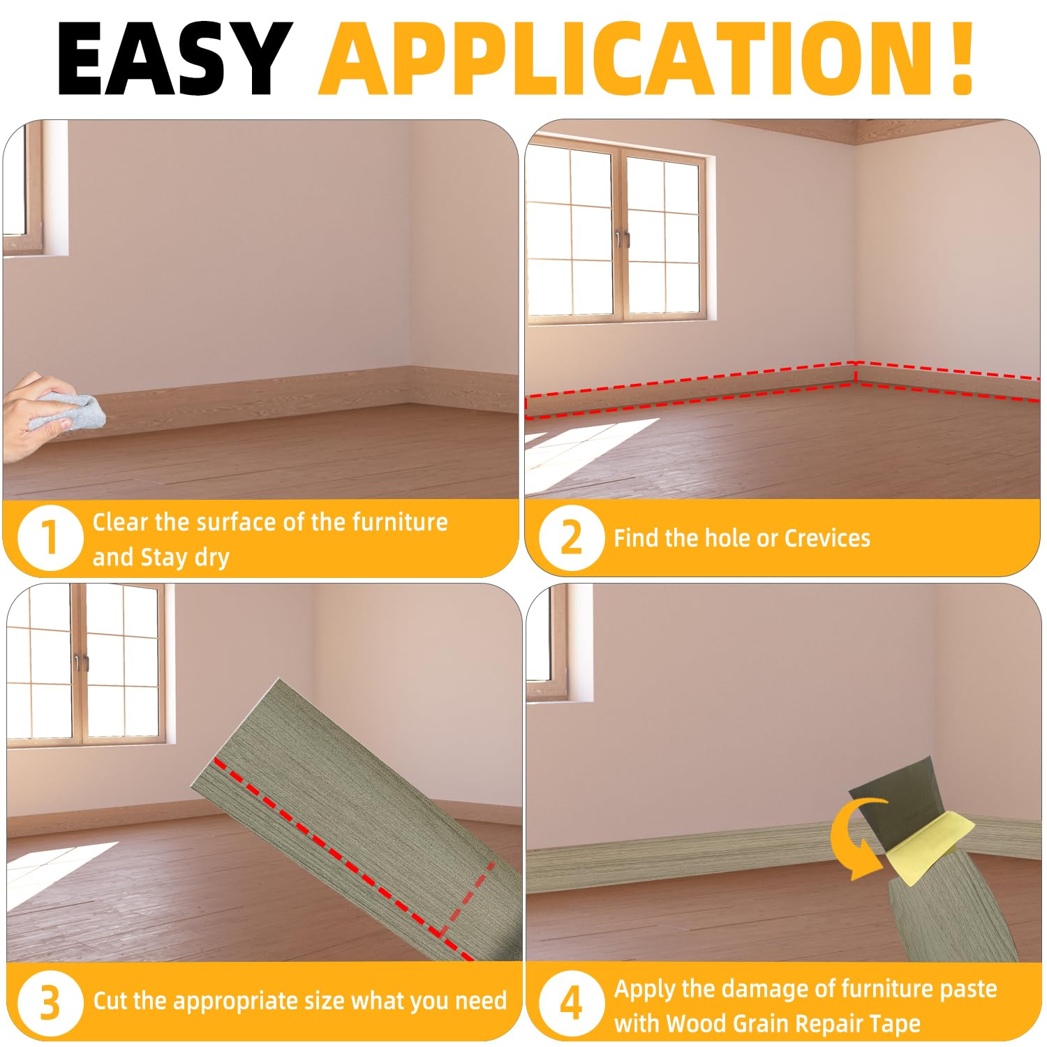 - √【HIGH QUALITY】- The Wood Grain Repair Tape is made of high quality Self Adhesive, which is durable and elastic, with a smooth surface and not easy to be dirty.When you repair Tables, Chairs, Baseboards, Doors, Windows, Floors, All Kinds of Furniture Renovation, Wood Grain Repair Tape will be your first choice.