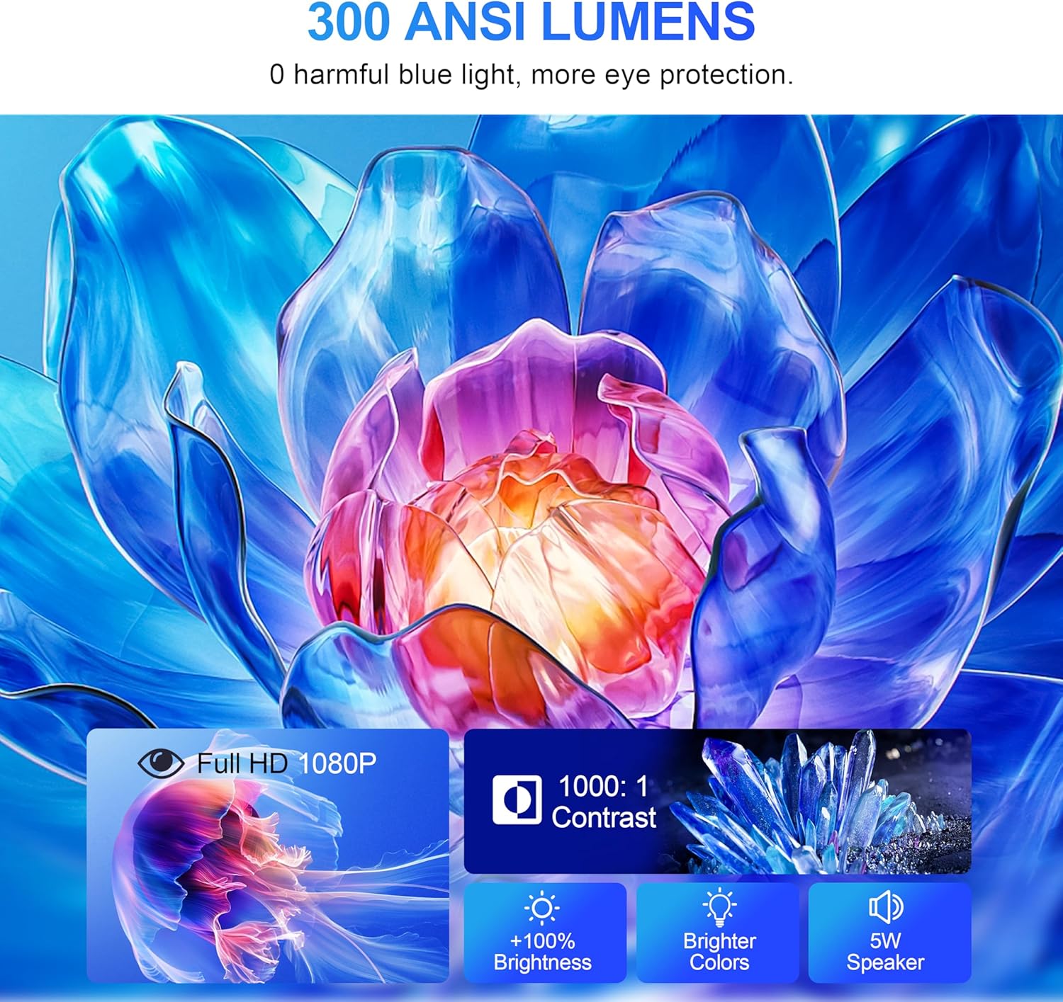 - ★【Native 1080P Resolution & 300 ANSI Lumen】Experience breathtaking visuals with true FHD 1080P resolution and 300 ANSI lumen of brightness. Every frame is sharp, vibrant, and color-accurate, while 4K playback support takes your viewing to the next level. Whether you’re in a dark room or enjoying an outdoor movie night, enjoy rich contrasts, deep blacks, and brilliant whites for a fully immersive cinematic experience.