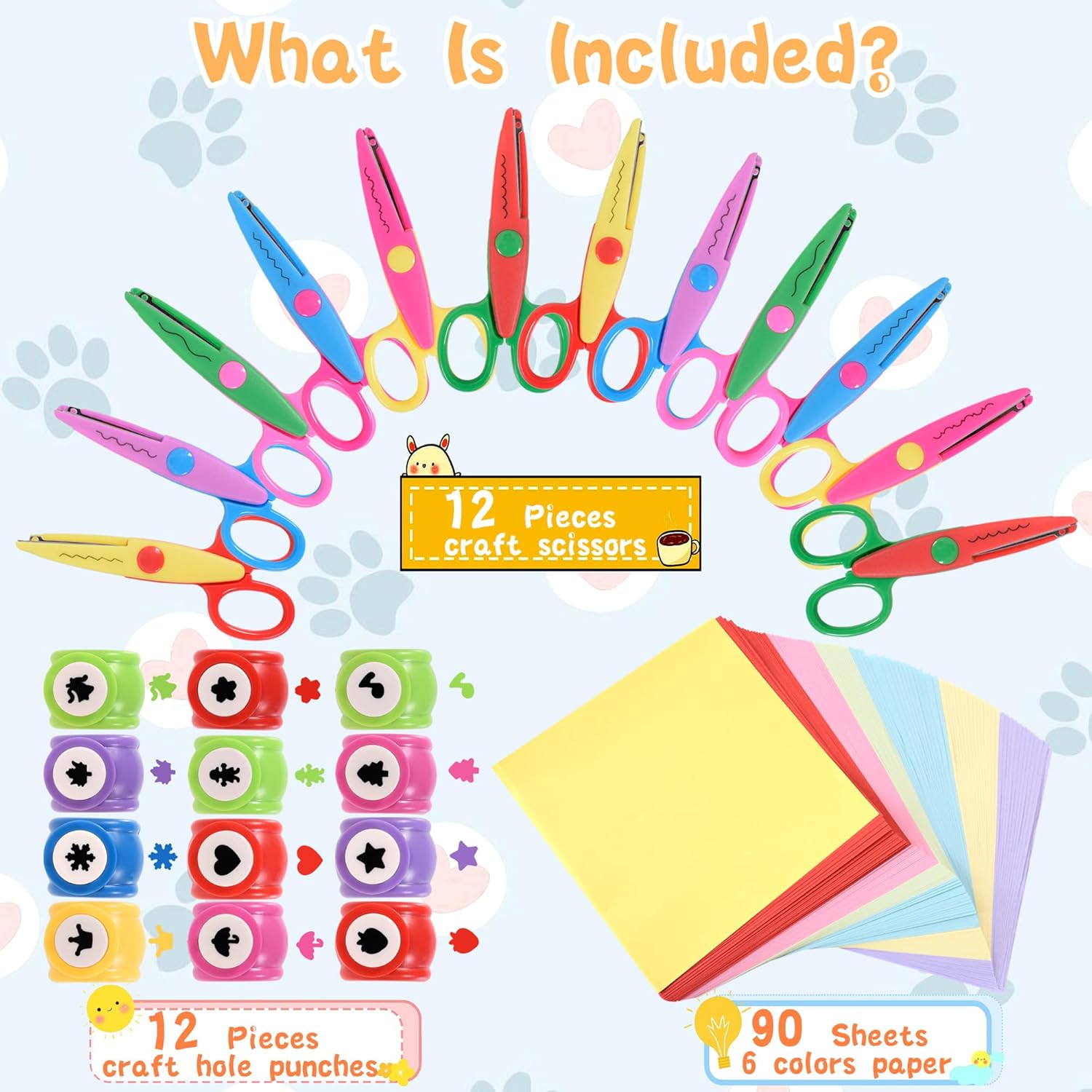 - All-in-One Craft Kit: Discover the ultimate crafting experience with our 12-piece craft scissors , 12-piece hole punch shapes, and 90 sheets of multicolored craft origami. Perfect for scrapbooking, card making, DIY projects, and school crafts