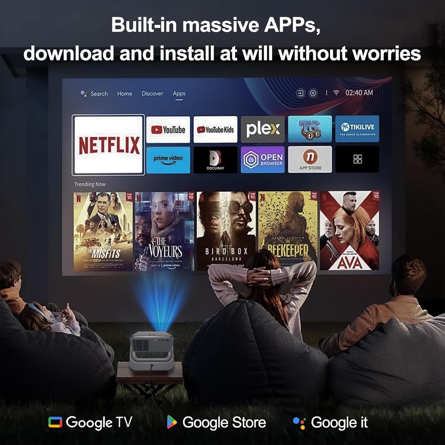 - Special Feature : "①Selling Point: The professional version of the Goggle ecosystem has a wide audience, with numerous apps that are not restricted and updated synchronously", "②Features: Native 1920x1080 pixels 4K codec support, Built-in Genuine GTV ecosystem,Goggle Store compatible with Neetflex/Yooutobe/Prrime Video/huuluu etc.with Goggle Voice Assistant; Light source 20000 lumens Color brightness 800ANSI; Camera range measurement auto focus & auto keystone; BT5.3 output &WiFi6.0; airScreen APPs support iOS/Android devices", "③Hardware: Built-in dual Speakers, 180°rotating with bracket,Night atmosphere lights design" "①Selling Point: The professional version of the Goggle ecosystem has a wide audience, with numerous apps that are not restricted and updated synchronously", "②Features: Native 1920x1080 pixels 4K codec support, B… See more