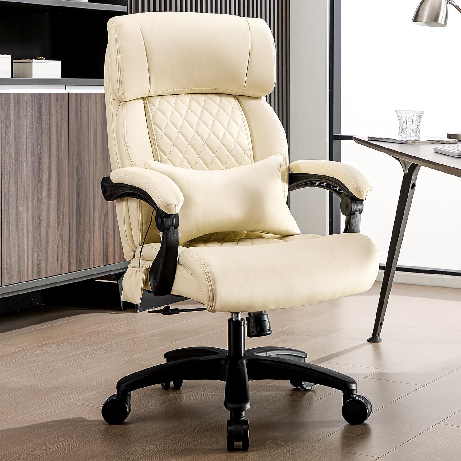 Lumbar Massage Office Chair, 500LBS Big and Tall Office Chair, Heavy Duty Ergonomic Executive Reclining Chair with High Back and Lumbar Support, Beige