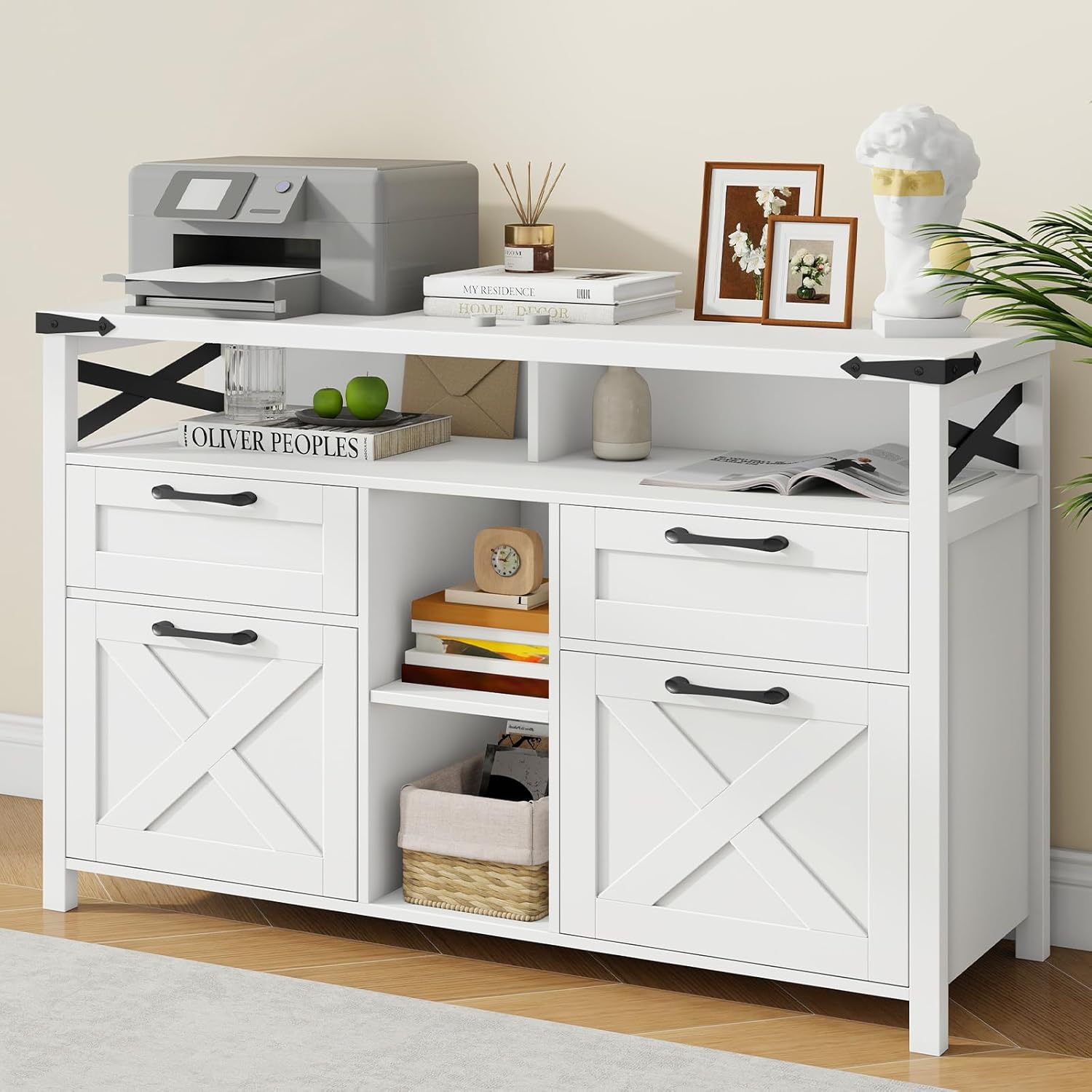 Farmhouse Filing Cabinet with Adjustable Shelf for Home Office, Lateral File Cabinets 4 Drawers with Open Storage Shelf, Filing Organization Storage Cabinets for Hanging Files Letter/A4.(White)